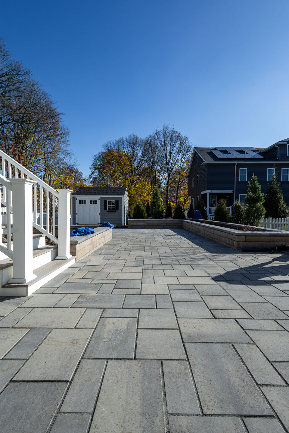 Located in Woburn, our Central Residence project involved transforming a steep, unsafe dirt and grass hill into a fully customized backyard retreat. We installed a spacious patio, sturdy retaining walls, a functional shed, a stylish pavilion, and integrated various landscaping features to enhance the space.